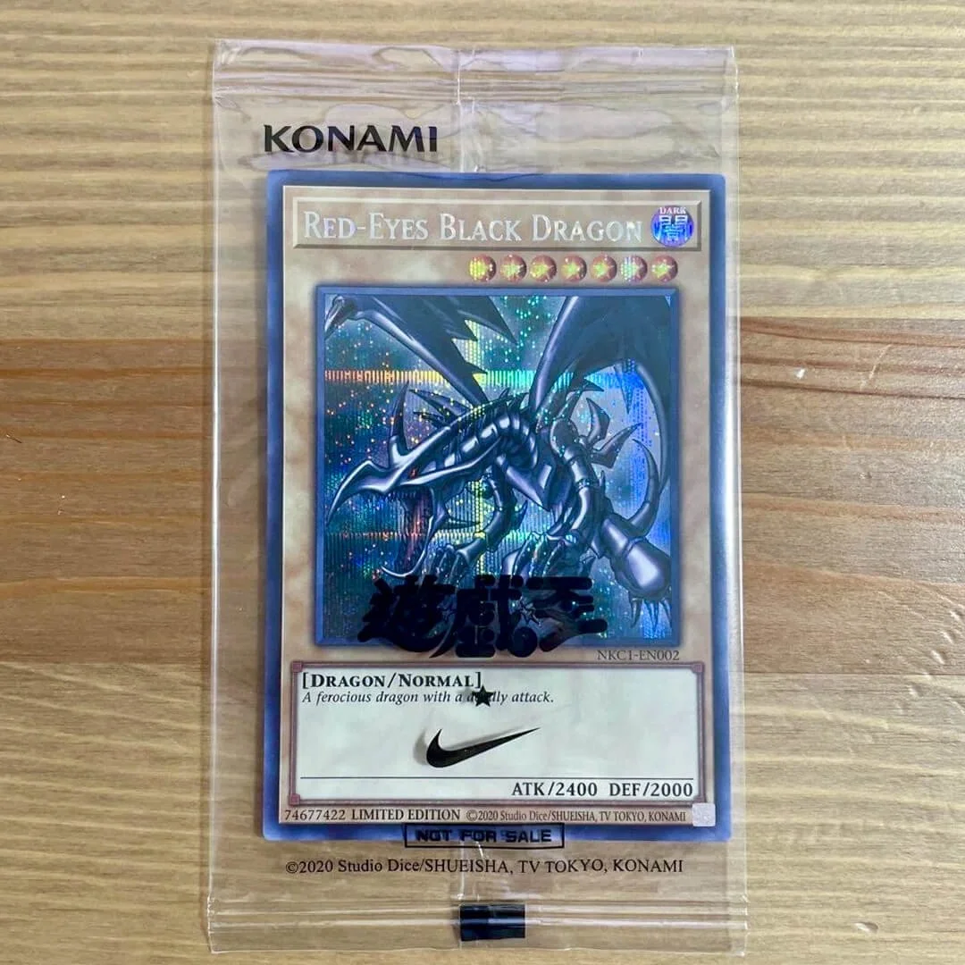 What it is: A special Red‑Eyes Black Dragon with a Nike emblem in the text box, cataloged as NKC1‑EN002 by TCG news trackers.